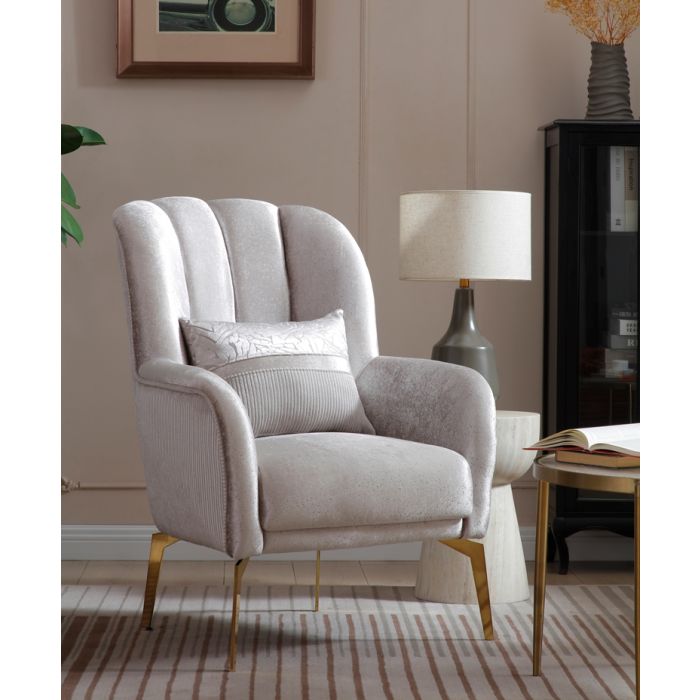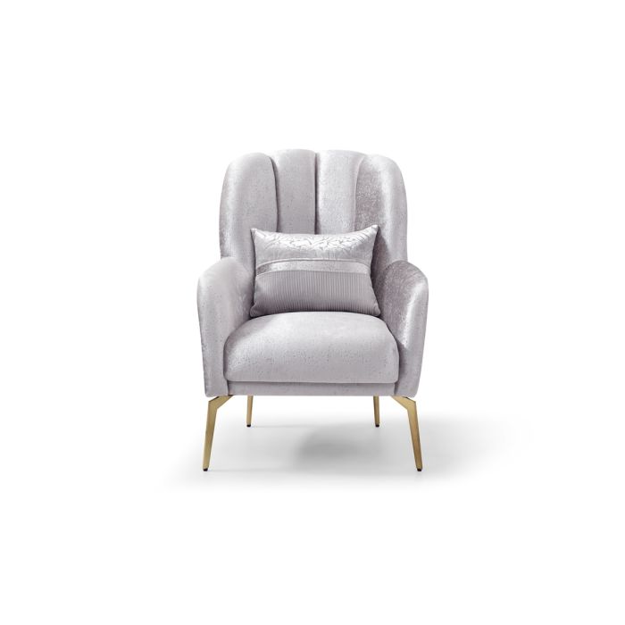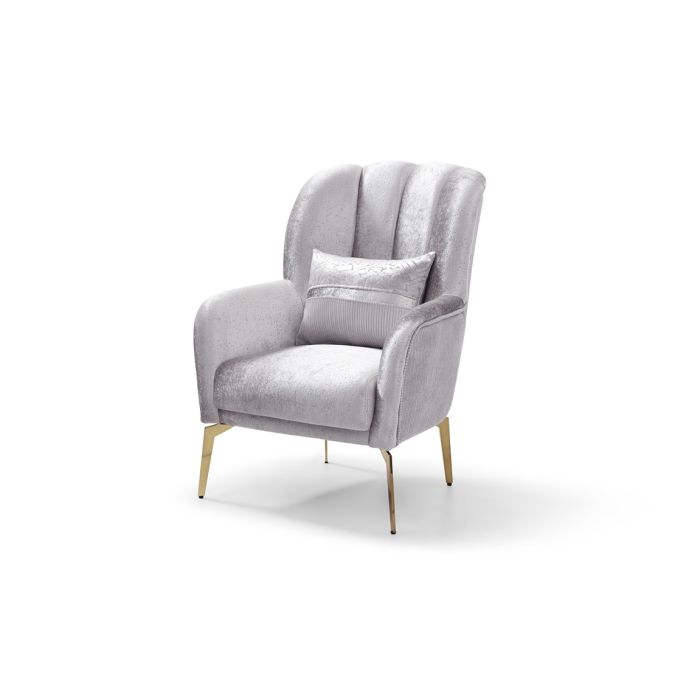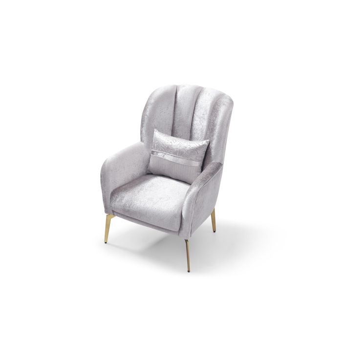 Stylish accent chair upholstered in soft silver-gray fabric with a scalloped high back design. Features plush seating, a decorative cushion, and elegant gold-finished legs for a modern, luxurious touch.