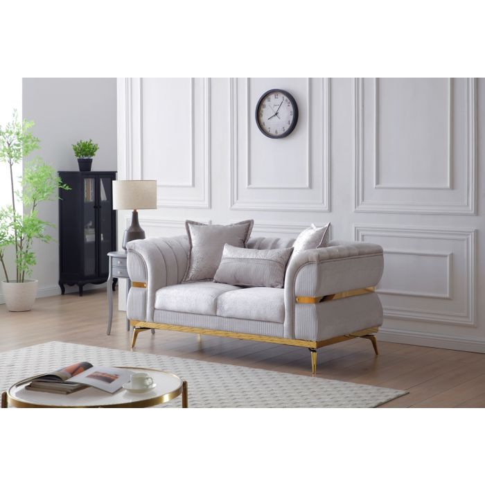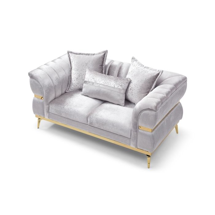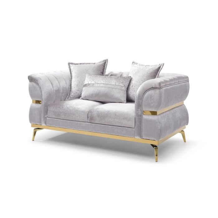 Elegant two-seater sofa upholstered in soft silver-gray fabric with a subtle pattern. Features plush cushions for comfort and gold accents on the base and legs, giving it a luxurious and modern touch.