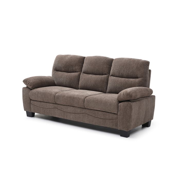 This is a modern three-seater sofa upholstered in a warm brown fabric. It features plush cushioning with a supportive tufted backrest, wide padded arms, and sturdy block-style legs. Designed for everyday comfort, it adds a cozy and inviting feel to any living room.