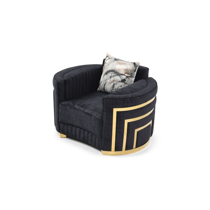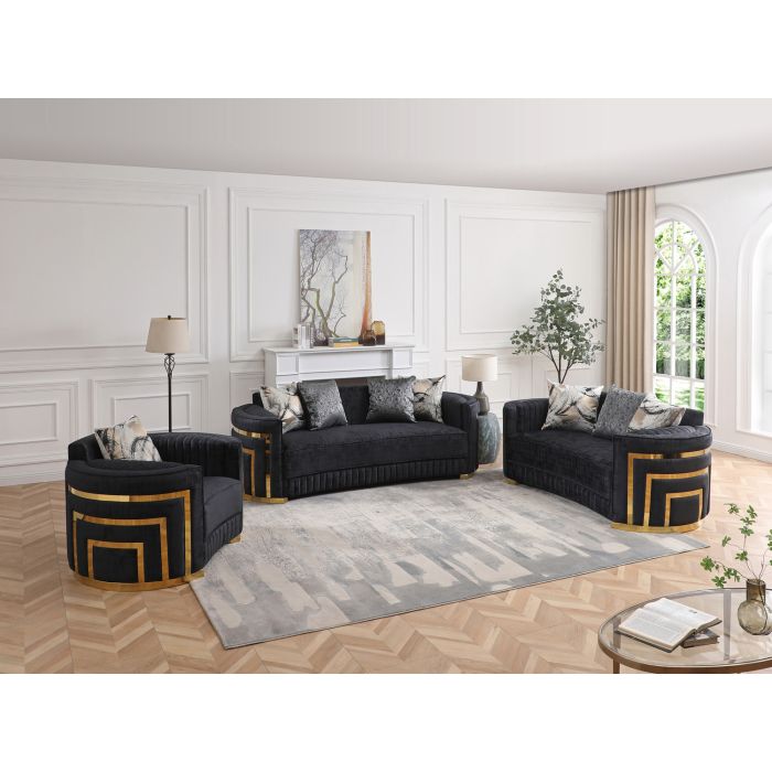 A luxurious black sofa with elegant gold accents and plush, patterned cushions, combining modern sophistication with timeless comfort.